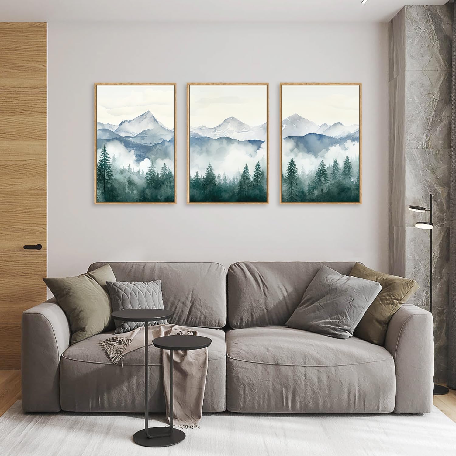Blue Mountain Wall Art Set Framed, Green Foggy Forest Wall Decor, Large Mountains Wall Painting, Boho Canvas Nature Art Print 3 Panel 16×24 Inches for Living Room, Bedroom, Office, Home