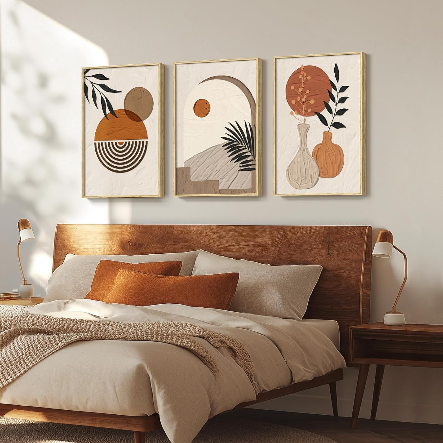 [As Good As The Picture]: The paintings combines geometric shapes, plant elements, natural landscapes, and incorporates Bohemian elements such as arches and moons, using neutral colors along with warm shades of orange to evoke a cozy ambiance reminiscent of autumn and winter. They make excellent wall decorations for various settings including living room, hallway, fireplace, bedroom, dining area, kitchen, study room, office, and more, adding a touch of artistic flair to your living spaces