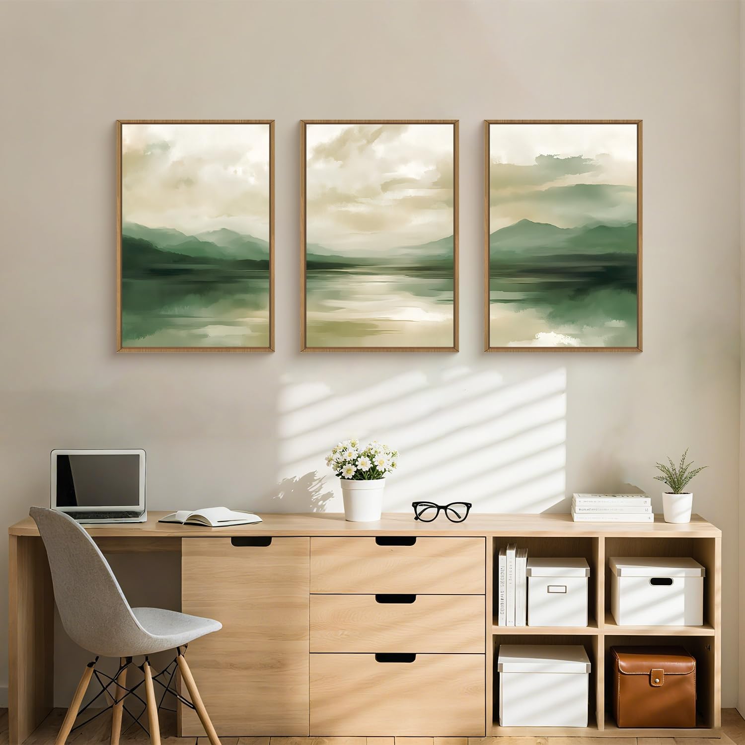 Sage Green Abstract Canvas Wall Art Set of 3, Framed Beige White Landscape Painting, Neutral Watercolor Mountain Prints, Nature Mountains Lake Prints, 16x24In Artwork for Living Room, Bedroom